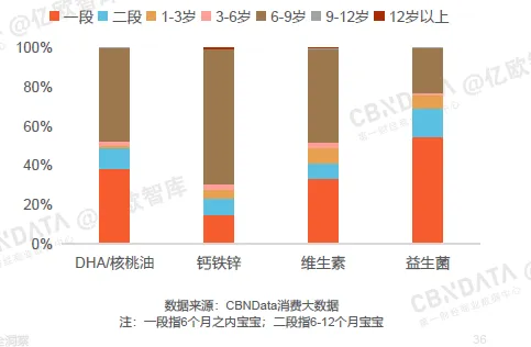 钙铁锌最大的需求来自身体发育较快的6-9岁儿童;DHA/核桃油、益生菌这两种针对性解决宝宝头脑发育和消化系统问题的营养品,在宝宝6个月之前就受到家长重视。