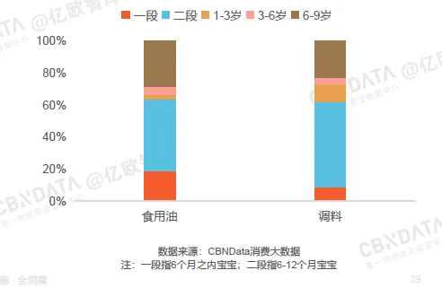 食用油和调料对于1岁以下宝宝的销售贡献都在6成以上,其中二段宝宝是最主要的需求群体;6-9岁儿童是仅次于二段宝宝的需求群体,销售贡献在2成以上。