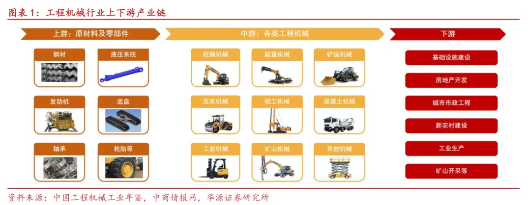 工程机械是国民经济建设的重要支柱产业之一,相对下游行业具备明显的“二阶导”属性,即行业总体需求更多取决于下游行业的扩张增量,对下游景气度变化更为敏感,被视为经济发展的晴雨表。工程机械行业主要产品包括挖掘机械、起重机械、铲运机械、压实机械、桩工机械、混凝土机械、工业机械及矿山机械等机械设备产品,上游涉及钢材、液压系统、发动机、底盘部件、轴承、轮胎等零部件原材料,下游涵盖了基建、房地产、城市市政、新农村建设、工业生产以及矿山开采等多个领域,为多个行业发展提供了不可或缺的设备支持。