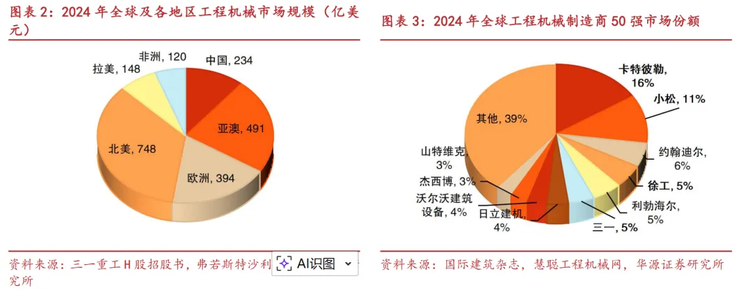 全球工程机械行业规模超万亿元,中国市场占据重要地位。根据弗若斯特沙利文,2024年全球工程机械行业规模达2135亿美元,其中北美、亚澳、欧洲、中国、拉美、非洲市场规模分别为748、491、394、234、148、120亿美元,其中中国市场占比11%,北美及欧洲地区组成的海外成熟市场占比53%,亚澳、拉美、非洲等地区组成的海外新兴市场占比为36%。