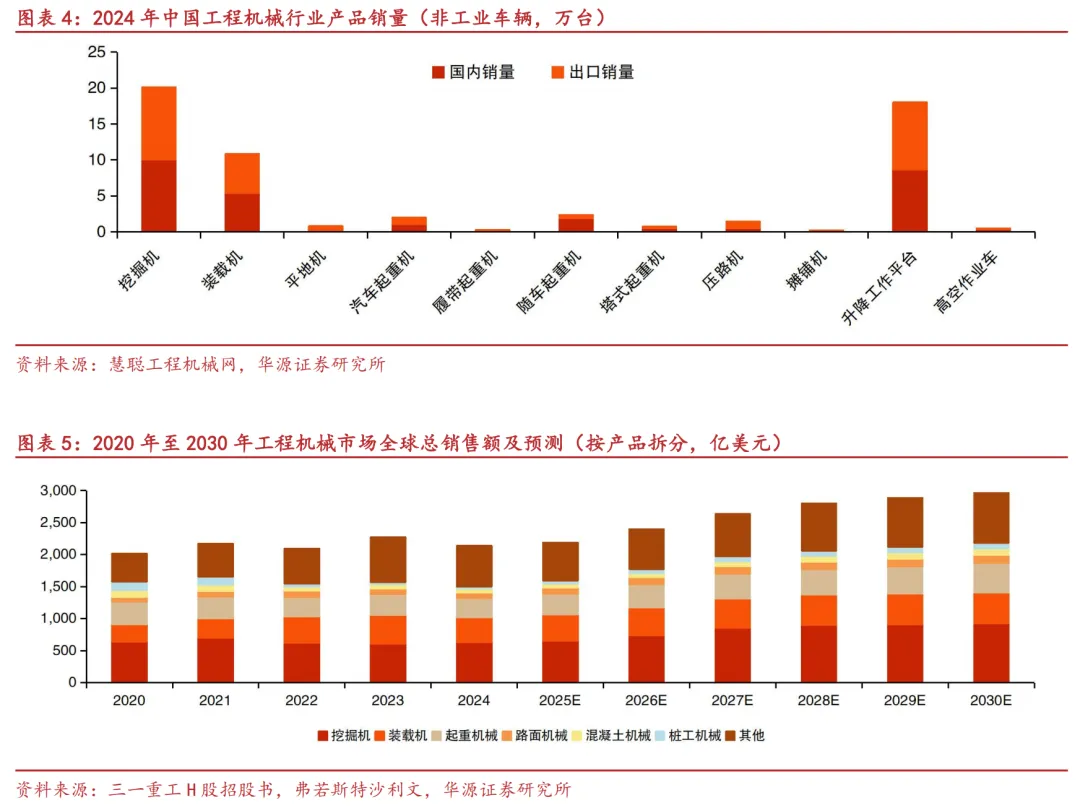 工程机械产品种类繁多,挖掘机械为代表性产品。从数量来看:中国工程机械企业2024年12大工程机械主要品类总销量共计185.5万台,其中主要用于工业物流生产的工业车辆销量最高达128.55万台。在除工业车辆外的传统工程机械设备中,挖掘机械、升降工作平台、装载机全年销量分别为201131台、179927台以及108209台,占非工业车辆工程机械销售总量的35%、32%以及19%。从价值量来看:各类传统工程机械产品中,2024年挖掘机械、装载机、起重机械全球市场规模分列前三位,分别为632、390以及302亿美元,占全行业市场规模30%、18%以及14%。无论从价值量还是数量上来衡量,挖掘机械都是工程机械行业具有重要代表性的产品,是研究行业整体变化重要的参考对象。