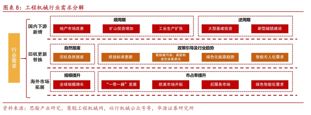 行业需求=国内下游新增+存量设备更新+海外市场拓展。我们对行业下游需求进行梳理拆解,我国工程机械行业需求主要由国内下游新增,存量设备更新换代以及海外市场拓展“三驾马车”拉动: