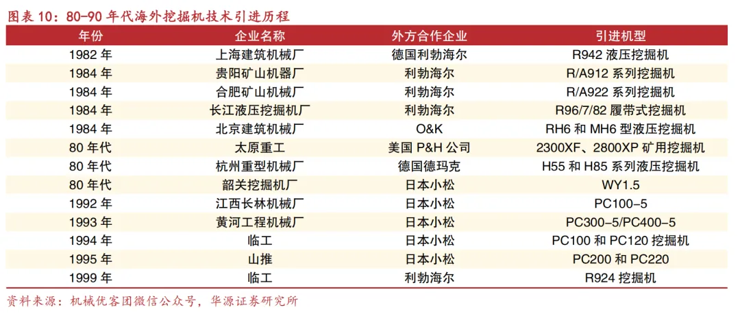 1979-1990年伴随国家改革开放,行业进入全面发展期。从1979年开始,国家开始了挖掘机行业的技术引进。先后有十几家企业参与,引进了国外包括利勃海尔、小松、德玛克、O&K、P&H等龙头企业在内的近20种产品,我国工程机械市场及技术水平开始蓬勃发展,行业内首家集团公司-徐工集团也在这一时期成功组建。1991-2003年,行业进入快速发展期,整体行业收入快速增长,2003年行业年销售额首次突破千亿大关,这一时期中联重科、三一重工、龙工等行业重点企业纷纷成立,柳工也于1993年成功改制上市。
