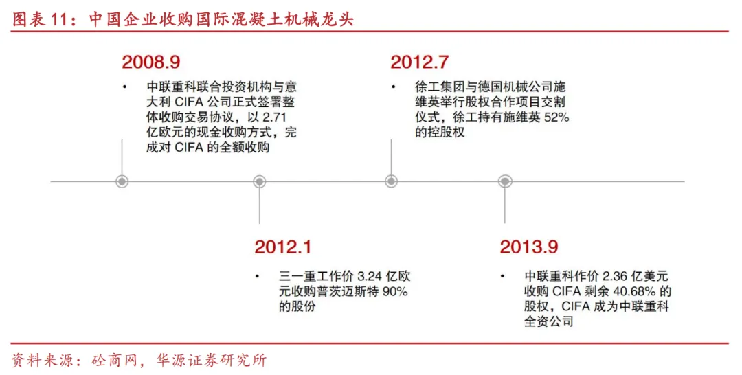2004-2011年行业进入了跨越式发展期。尤其在国家“四万亿”政策刺激后,我国工程机械需求快速增长,2009年我国工程机械行业销售收入达到3157亿元,跃居世界首位。大批国际跨国公司进入中国,与中国企业建立合资公司或兴办独资企业。同时中国工程机械企业持续加大研发投入,自主创新能力显著增强,大型装载机、全地面起重机、大吨位挖掘机等一批高端产品成功实现国产化替代,打破了国外企业的长期垄断,并积极开拓海外市场,通过构建广泛的销售网络、开展深度的国际合作等方式,开始向国际型、规模型、综合型大企业方向迈进,中联重科收购国际混凝土巨头意大利CIFA、徐工并购德国FT公司和荷兰AMAC公司就是这一时期的典型缩影。