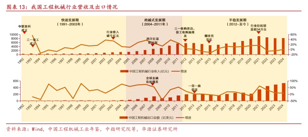 2012年开始,中国工程机械行业逐渐成熟,进入平稳发展期,这一时期,在地产及基建行业需求拉动下,21年行业挖掘机销量达到了34.28万台的历史顶点,整体营收超9000亿元。同时国产工程机械企业制造技术达到国际先进水平,国产机械市场份额不断提升,挖机国产化率自21年开始持续保持在70%以上高位。同时随着后期国内需求承压,中国工程机械企业纷纷开始加大力度向海外拓展,自2012年起至2024年行业出口额达529亿美元,CAGR达8.82%,中国工程机械企业开始真正地在全球市场与世界顶尖对手交锋。