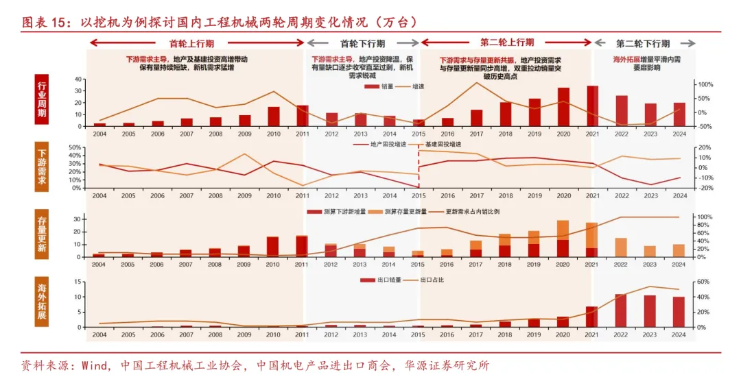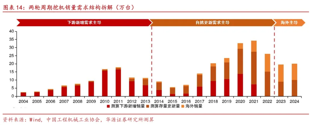 通过拆解计算行业需求结构:2004-2011年第一轮上行周期,下游新增需求是销量增长的主要驱动因素,2011至2015年的下行周期中,更新需求逐渐增长与下游新增需求共同影响销量;2015-2021年第二轮上行周期,存量更新开始成为行业销量的主导因素,同时下游新增需求与海外需求同步发力,带动周期上行;2021年后的下行周期中,下游新增需求锐减,海外需求与存量更新成为拉动销量的主导因素。