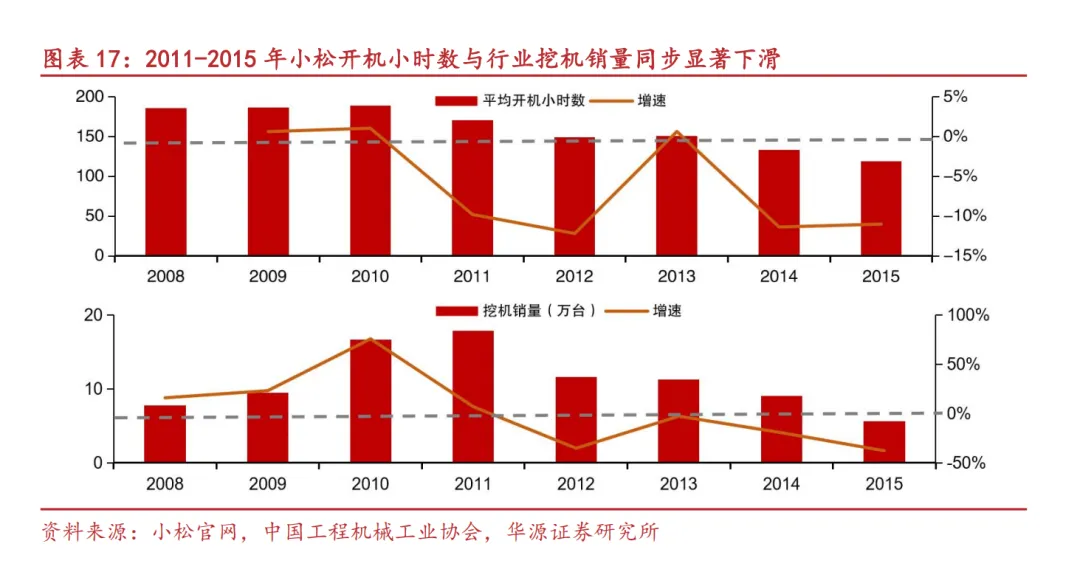 首轮下行周期(11-15年):在国家大规模基建刺激政策力度逐渐减弱以及为遏制房价增长过快出台“国十条”等房地产限购政策的背景下,下游投资增速迅速滑落,尤其是对行业销量影响较大的房地产行业,投资增速从2011年的28%迅速滑落,至2015年已不足1%。从可以直接反映实际工作需求量的小松挖掘机开工小时数来看,2011年月平均开工小时数从170.58小时迅速下降至2015年的119.13小时。因此挖机销量也从11年最高峰的17.84万台,迅速回落到15年5.6万台,降幅超68%。