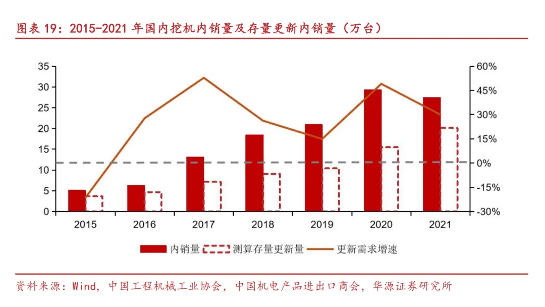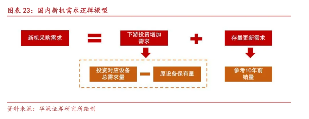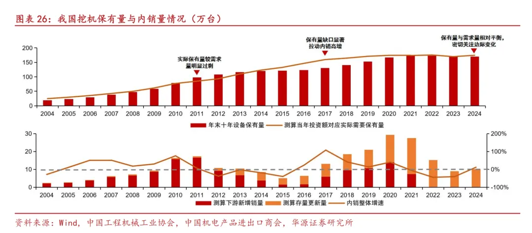 首先明确销量逻辑,年末保有量-年初保有量=当年下游需求新增量+存量更新量-存量淘汰量,在下游投资持续增长的情况下,我们假设全部淘汰的存量机械都得到更新,则下游需求新增量=年末保有量-年初保有量;
