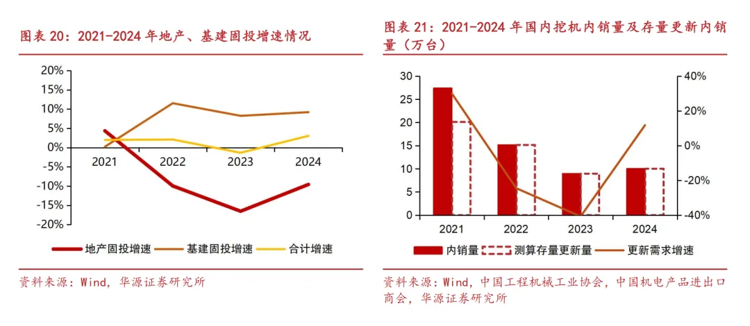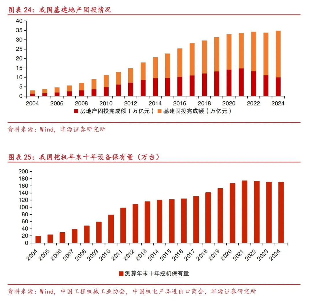 第二轮下行周期(21年至24年):2020年“三道红线”政策出台,大量房地产企业融资受限,资金链压力持续紧张,开发能力和意愿急速下降。同时叠加人口负增长及城镇化率逐渐步入高位等因素,工程机械主要下游地产及基建行业的整体固投增速维持在5%以下,尤其房地产行业固定投资从2022年开始持续保持负增长,因此下游新增需求持续低迷。同时存量更新需求量也随着更新高峰的结束,从2021年20万台的顶点下滑到2024年10万台的低位。在下游新增与存量更新需求的双重下滑之下,2021至2024年间,挖机国内销量从27万台快速下滑至10万台,跌幅达63%。