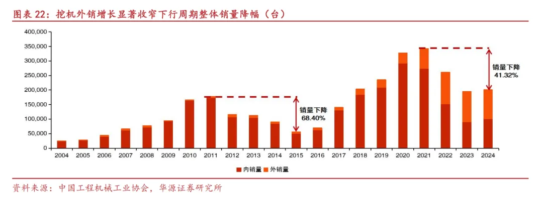 实际保有量不足/过剩影响下游内需,市场内销整体趋势一致但存在一定滞后性。以挖机设备为例,将实际保有量与需求保有量进行对比,可以清晰地看到二者关系对内销的影响:(1)2003-2011年,2003年至2009年行业需求保有量长期超过实际保有量,整体挖机内销量持续高增,2010年实际保有量首次超过需求保有量,但由于市场惯性,行业内销量仍保持增长。(2)2012-2015年,由于上一阶段市场预期过于乐观,趋势判断相对滞后,导致保有量过快增长,实际保有量在2012年出现明显过剩,因此内销量也出现了断崖式下跌,虽然在2014年后需求缺口逐渐打开,或由于缺乏市场信心等原因,直至2015年内销量仍相对萎靡。(3)2016-2021年,实际保有量较需求量缺口逐渐拉大,市场销量反馈相对迟钝,但整体向上趋势明朗,内销开始逐步加速,并在2020年达到历史高点并在次年仍保持高位水平。(4)2022-2024年实际设备保有量与需求量逐步达到平衡,下游新增需求几乎为0,内销量也随之断崖式下跌。