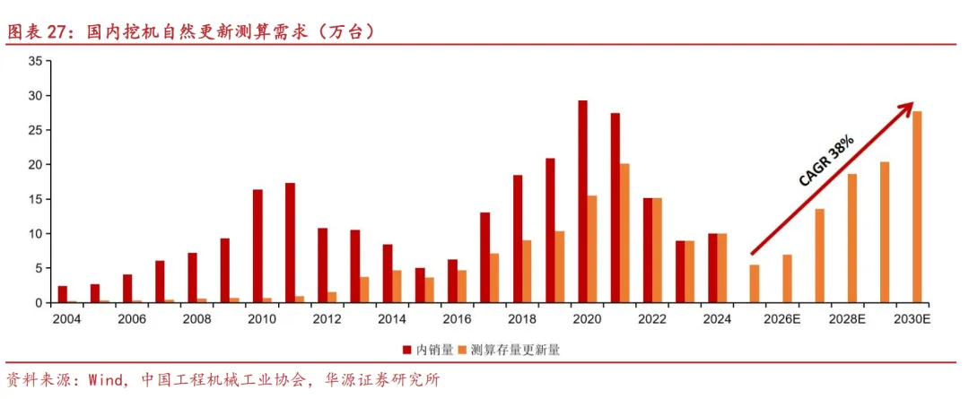 测算存量设备更新量:通过参考存量设备更新比例,按对应N-10年销售情况计算,预计2025-2030年期间,存量更新内销需求量有望从5.5万台快速提升至27.7万台,理想CAGR可达38%,同时排放标准升级、电动化设备需求的增长以及国内二手机大量出口海外的趋势下,整体进程和空间有望进一步加速和放大,存量设备更新或将是本轮内需周期复苏的首要驱动因素。