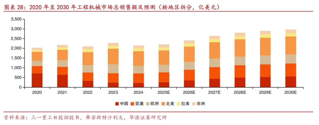新兴市场:新兴市场是全球工程机械行业增长较快的区域,2024年新兴市场销售额合计为993亿美元,占全球市场的46.5%,到2030年预计将增长至1564亿美元,占比上升至52.8%,复合年增长率为7.9%。20年至24年拉美及亚澳市场增长迅速,年复合增长率分别为10.8%和6.9%。拉丁美洲市场主要受矿山机械需求的推动,巴西、智利、阿根廷等国的金属矿产资源需求回升带动大量基础设施及矿业开采方面工程机械需求。亚澳地区增长主要受益于大规模基础设施投资和快速的城市化进程。在东南亚,特别是印度尼西亚、越南、泰国等国受益于城市化和工业化进程的加速,基础设施投资显著增加,带动了工程机械需求的增长。而非洲市场各国家也提出了相应基建投资方案,未来工程机械需求有望持续增长。