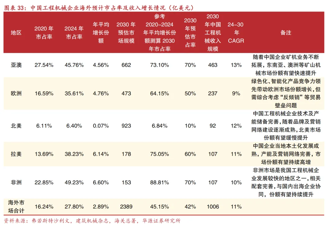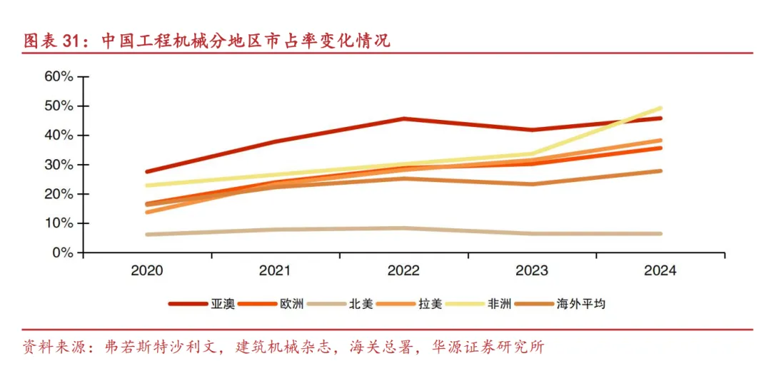 拉丁美洲:拉丁美洲是我国工程机械企业较早开拓的海外市场之一,徐工、柳工等中国龙头企业在拉丁美洲建设了成熟的工程机械产业园区。经过多年发展,拉美地区已成为中国企业海外产能建设中的重要一环,也是重要的海外市场之一,2020-2024年,中国企业拉丁美洲市场份额由13.69%快速提升至38.23%,年平均份额提升达6.14%;