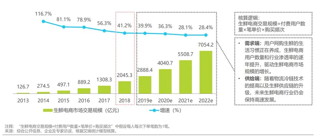 2016-2017年市场虽迎来洗牌期,大量中小型生鲜电商或倒闭或被并购,市场遇冷。2018年生鲜电商市场交易规模突破2000亿元。进入2019年以来,生鲜新零售模式逐渐归于“平静”,从疯狂扩张步入战线收缩调整阶段。据艾瑞预计,未来3年中国生鲜电商行业仍会保持年均35%的增长率。未来随着生鲜电商模式的成熟、网购生鲜用户覆盖数量愈发广泛以及技术成熟、生鲜电商供应链的升级,生鲜电商行业仍将保持快速发展。