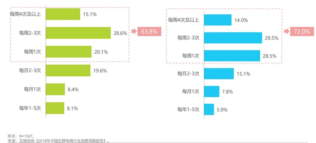 从消费端来看,中国消费者网购生鲜的习惯已经养成。调研数据显示,每周购买1次以上的生鲜网购用户占比达63.8%,其中每周购买2-3次的用户占比为28.6%。从购买生鲜品类来看,72.0%的用户网购蔬菜的频次在每周1次以上,远高于整体购买生鲜频次。