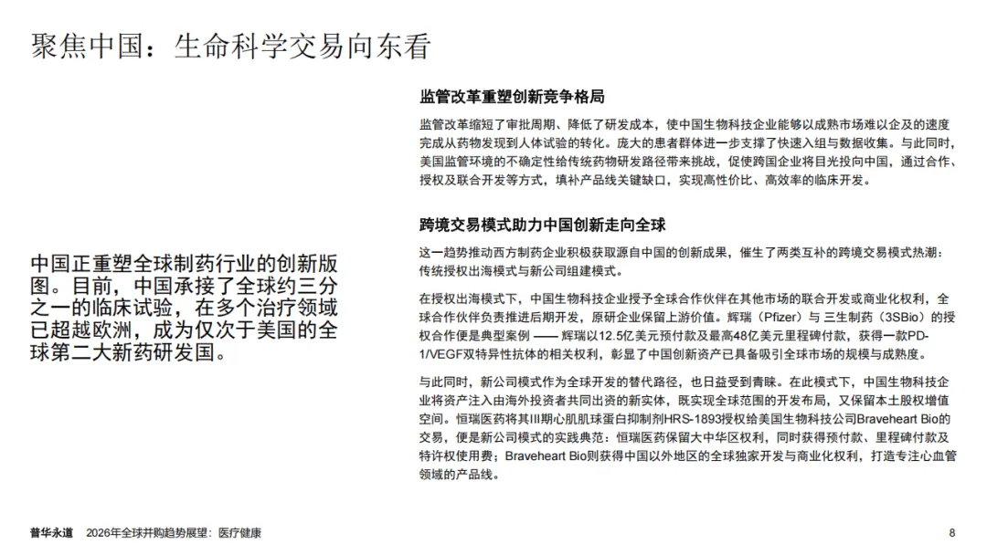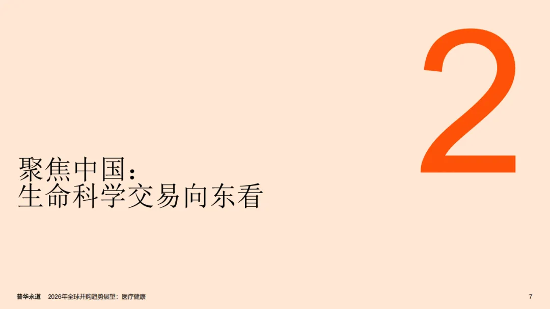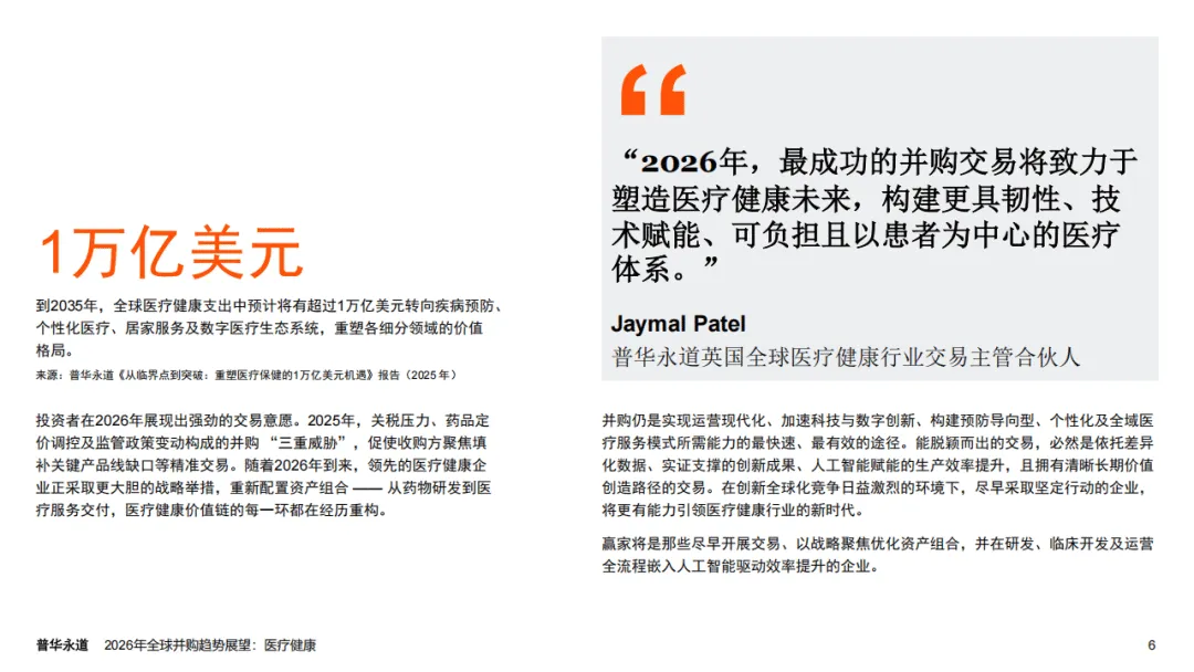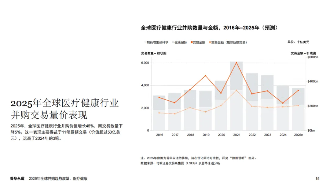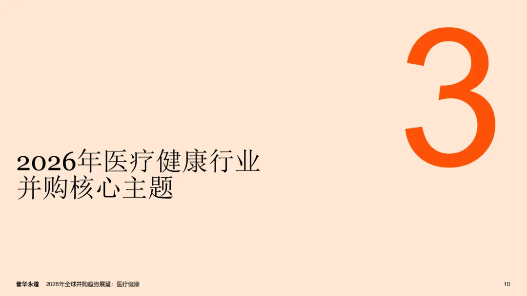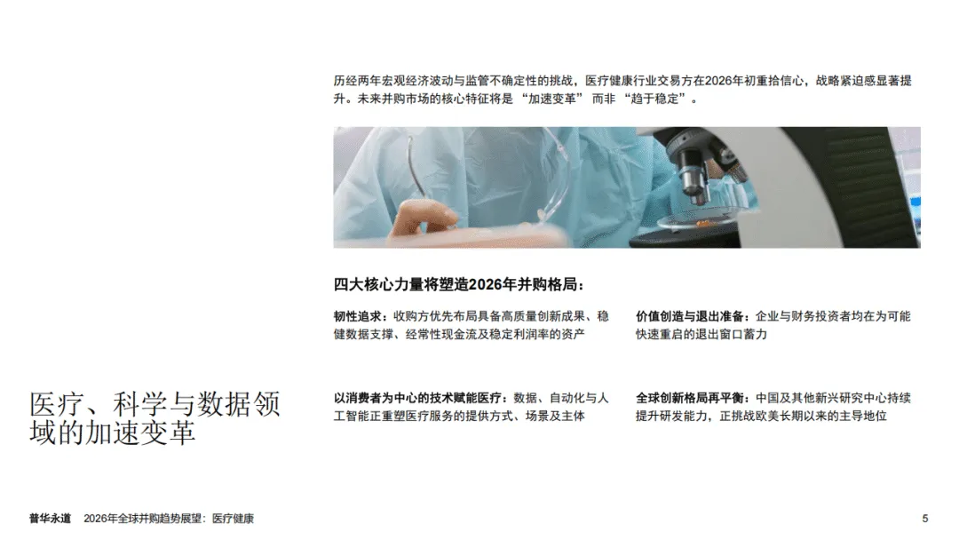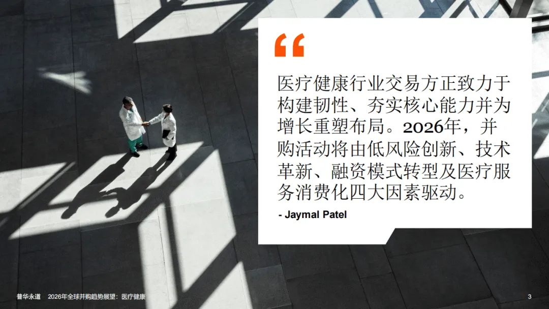 普华永道2026年全球医疗健康行业并购趋势展望报告指出,历经两年宏观经济与监管挑战,行业交易方在2026年初重拾信心,并购市场将呈现“加速变革”特征,由低风险创新、技术革新等四大因素驱动,并购也成为行业实现模式升级、创新提速的核心途径。