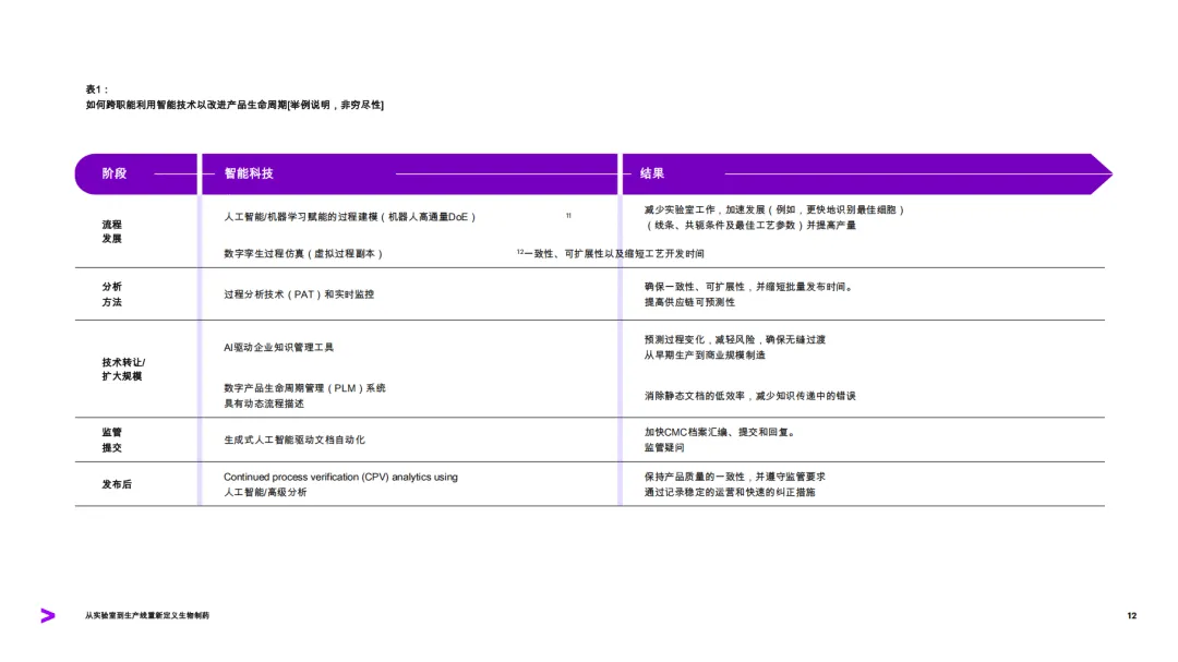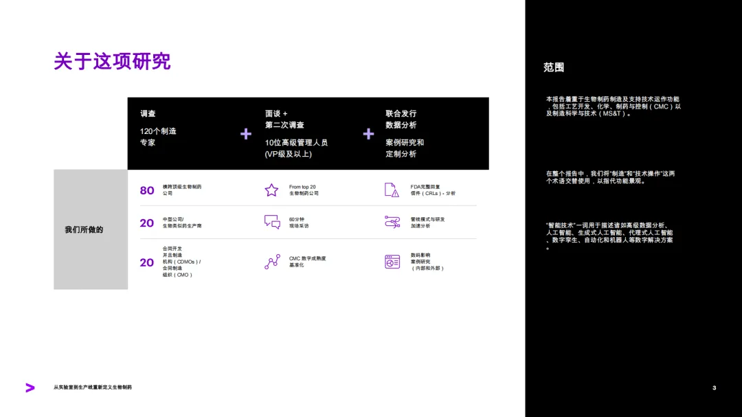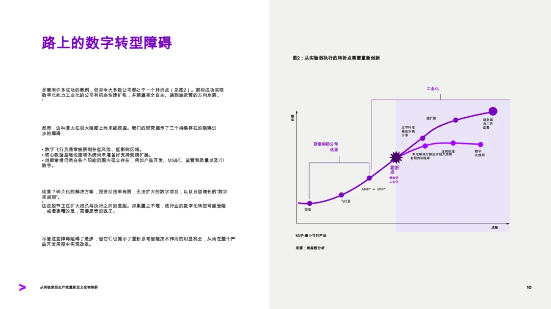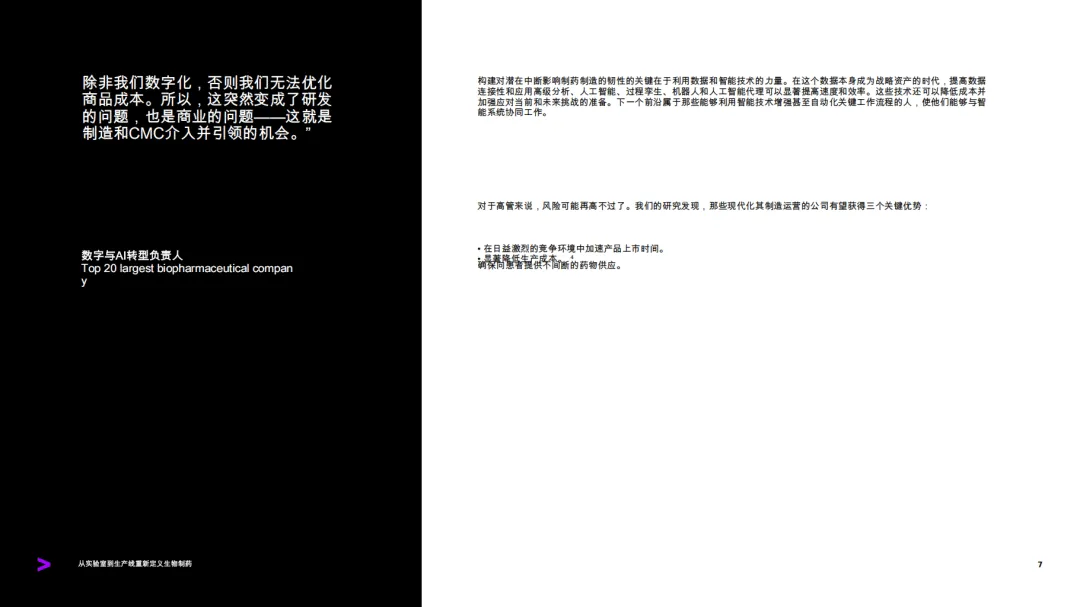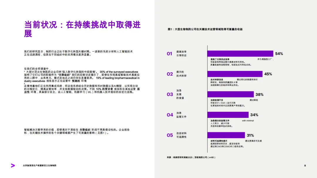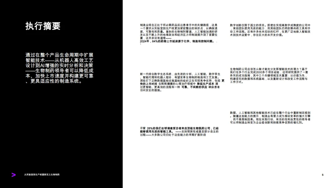 这份由埃森哲发布的报告聚焦生物制药行业制造环节的数字化转型,指出行业正处于从实验室到生产线深度整合的关键转折点,智能技术成为推动生物制药生产更智能、快速且可扩展的核心驱动力。研究基于对120位制造专家、10位顶级生物制药公司高管的调研及FDA完整回复函分析等,剖析了行业现状、转型障碍,并提出了落地智能技术的实践路线。