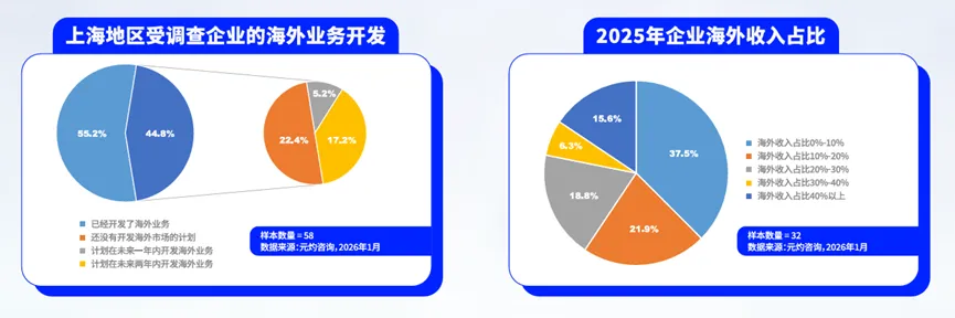 二、企业出海成为增长的重要引擎,上海地区受调查企业中超过半数已经有海外业务;海外收入已经成为企业重要的营收来源