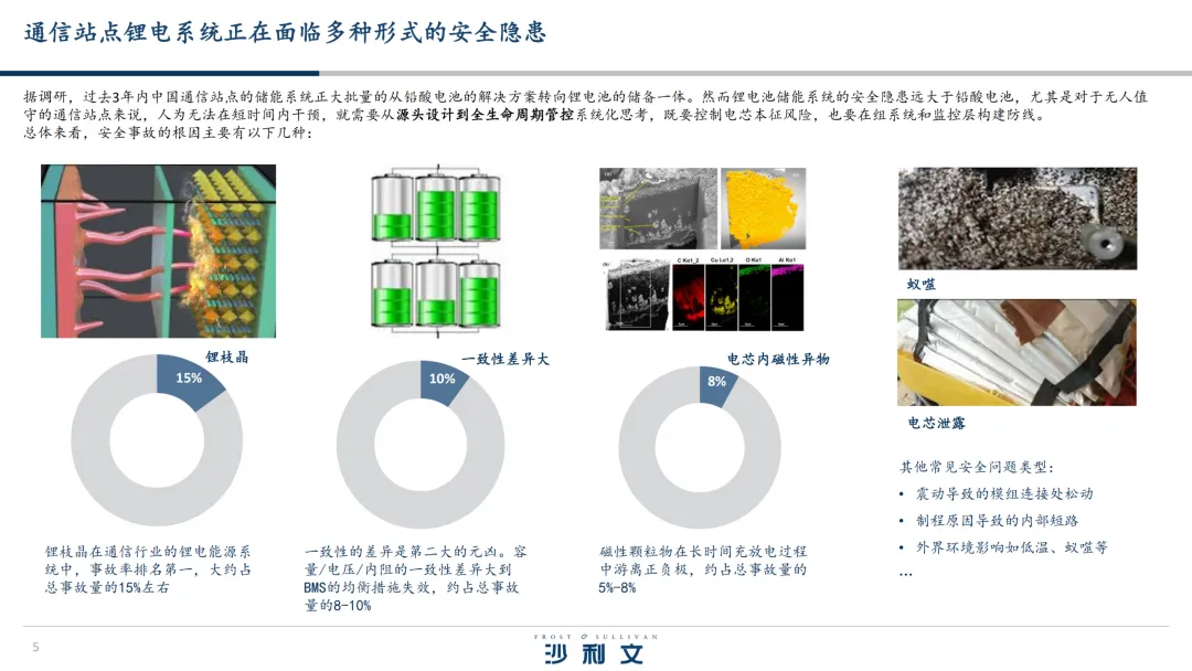 随着锂电池在通信站点的批量应用,安全隐患日益突出。锂枝晶问题占事故总量的15%,电芯一致性差异和磁性异物分别占8-10%与5-8%,此外还有震动导致的模组松动、制程缺陷引发的内部短路等风险。全球多地已发生安全事件,如英国埃塞克斯郡通信站点因电芯制程问题引发火灾,美国加州5G站点因电芯品控缺陷起火,法国里昂机房因通风不足导致氢集聚爆炸。因此,全生命周期安全管控至关重要,需从准入认证、采购选型到运行运维构建系统化防控体系。