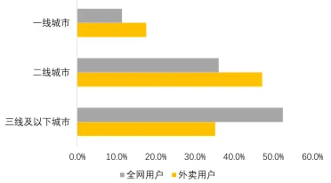 一线和二线城市是外卖的主力消费市场。数据显示,外卖用户在一线和二线城市的占比远高于整体互联网用户占比,说明外卖目前在一线和二线城市强渗透,在三线及以下城市的渗透需要加强。