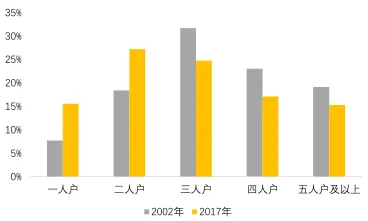 国家统计局的人口抽样调查数据显示,过去十几年间,我国的家庭人口结构发生巨大变化,一人户家庭占总户数的比例从 2002 年的 7.7%增加到 2017 年的 15.6%,二人户家庭占总户数的比例从 2002 年的 18.4%增长到 2017 年的 27.2%。伴随着家庭结构日趋小型化,家庭饮食结构发生了很大变化,在外吃饭次数明显增加,外卖成为中国家庭不可或缺的生活方式,生鲜商品消费也实现了快速增长。