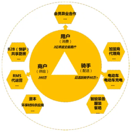 目前美团外卖已经形成一个成熟的由 360 万商户、60 多万日活跃骑手和 3 亿年度交易用户构成的小生态,分别担任着供给、配送、消费的功能,但随着外卖规模的迅速发展,外卖这一业态已经从“商户-骑手-用户”的小生态逐渐向包含上下游生态伙伴在内的开放共赢的大生态发展。