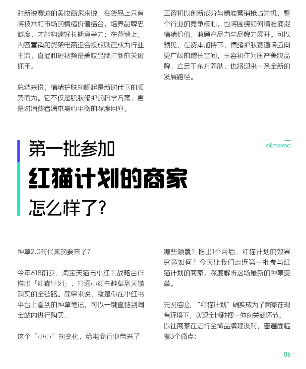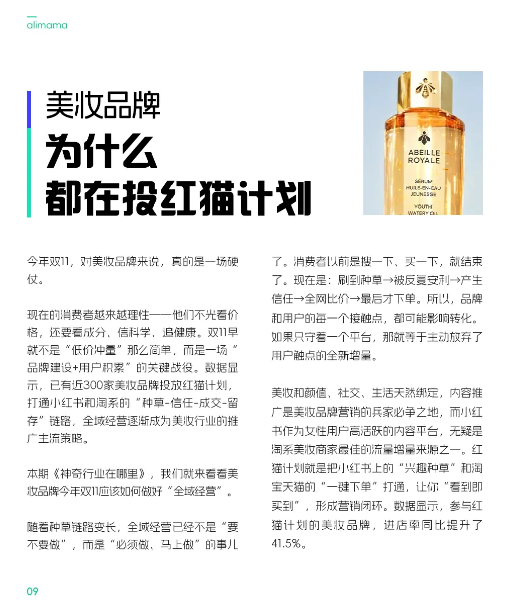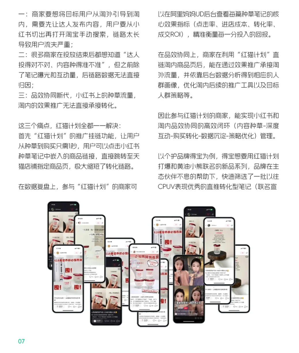 报告聚焦#美妆、#服饰、#运动户外 等多个行业,剖析各赛道新趋势与破局思路:东方情绪护肤成美妆新顶流,服饰行业受高退货率困扰,女性成户外行业核心增量,#宠物 友好型家电、全身#护理 等赛道快速崛起。红猫计划打通小红书与淘系链路成全域经营关键,各品牌依托阿里妈妈数智工具,精准洞察需求、优化投放策略,实现品效协同与增长,行业竞争更注重情绪价值、精准运营与技术落地。
