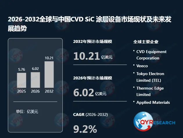 根据QYR(恒州博智)的统计及预测,2025年全球CVD SiC 涂层设备市场销售额达到了5.76亿美元,预计2032年将达到10.21亿美元,年复合增长率(CAGR)为9.2%(2026-2032)。