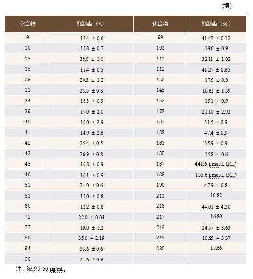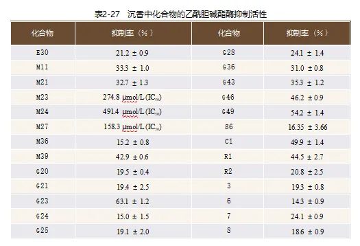 戴好富研究组最先发现沉香中部分化合物的抗乙酰胆碱酯酶活性,后续也陆续有其他研究人员,在沉香中发现了具有此种活性的化学成分(戴好富,2017;Liet al., 2021)。从目前的活性测试结果显示(表2-27),沉香中乙酰胆碱酯酶抑制活性的成分,主要为倍半萜和2-(2-苯乙基)色酮类成分,这些活性成分的发现,为开发新的乙酰胆碱酯酶抑制剂提供了候选化合物。