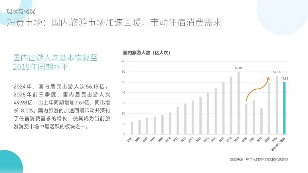 数据显示,2024 年国内居民出游人次达到 56.15 亿,2025 年前三季度这一数字就攀升至 49.98 亿,较上年同期增长 18.0%,出游人次基本恢复至 2019 年同期水平。旅游消费的活跃直接带动了住宿需求的攀升,民宿成为旅游住宿消费中最活跃的板块之一,不仅国内游客对民宿的选择更加多元,入境旅游市场的复苏也让民宿迎来了更多国际客源。
