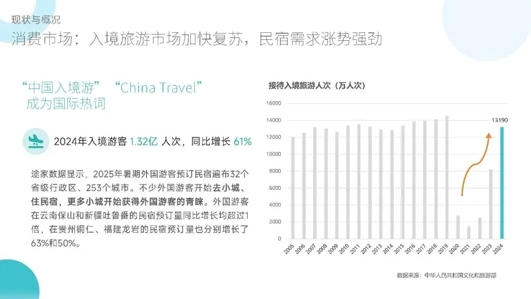 2024 年入境游客达 1.32 亿人次,同比增长 61%,2025 年暑期外国游客预订民宿的范围覆盖 32 个省级行政区、253 个城市,小城民宿更是成为国际游客的新选择,云南保山、新疆吐鲁番的外国游客民宿预订量同比翻倍,贵州铜仁、福建龙岩也分别实现 63% 和 50% 的增长。出境旅游市场的稳步回升也让民宿的消费场景延伸至海外,2024 年出境游客 1.46 亿人次,中国游客在海外更偏爱高性价比的在地化民宿体验,东京、槟城等城市的特色民宿更是出现预订火爆的情况。