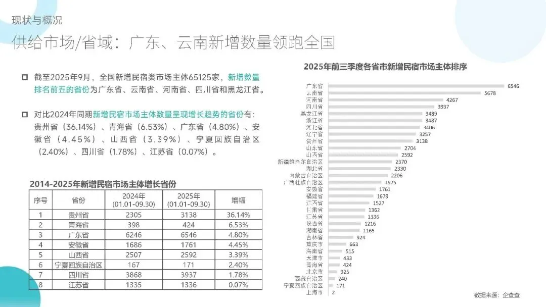 截至 2025 年 9 月,全国新增民宿类市场主体 65125 家,广东省、云南省、河南省、四川省、黑龙江省位列新增数量前五,其中广东省以 6546 家的新增数量领跑全国。区域发展上,多个省份实现民宿市场主体的同比增长,贵州省增幅达到 36.14%,成为增长最快的省份,青海省、广东省、安徽省也分别实现 6.53%、4.80%、4.45% 的增长。