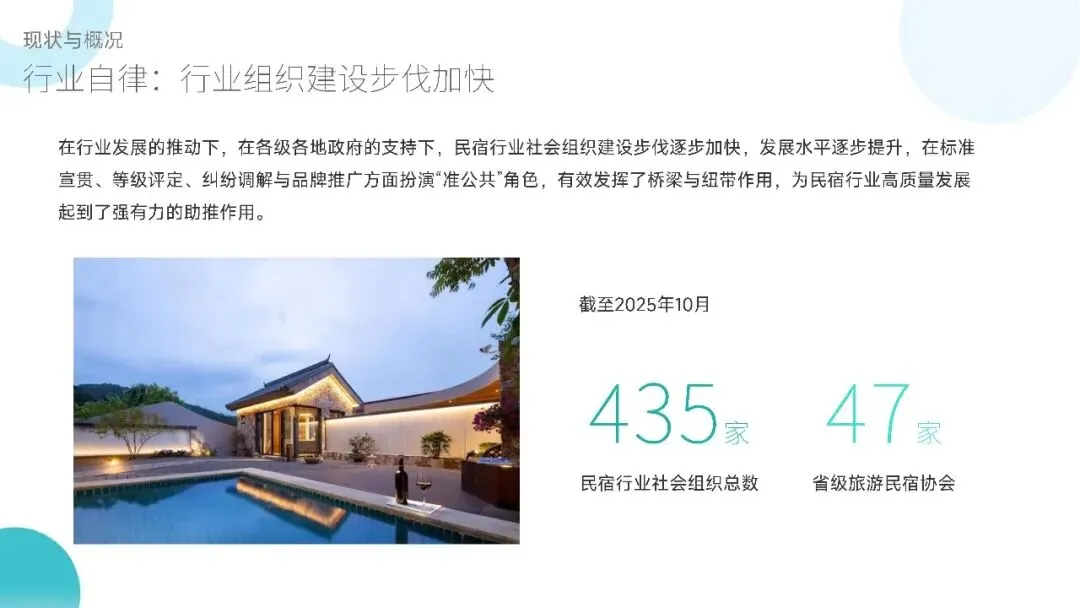 截至 2025 年 10 月,全国已有 435 家民宿行业社会组织,其中省级旅游民宿协会 47 家,这些组织在标准宣贯、等级评定、品牌推广等方面发挥着重要作用。民宿管家被认定为新职业后,行业人才培养的职业化进程不断提速,各地文旅、人社部门与行业协会、职业院校联动开展技能培训和等级认定,产教研协同的人才培养体系逐步形成,民宿品牌与旅游院校的合作也为行业储备了大量后备人才,为民宿行业的高质量发展提供了人才支撑。