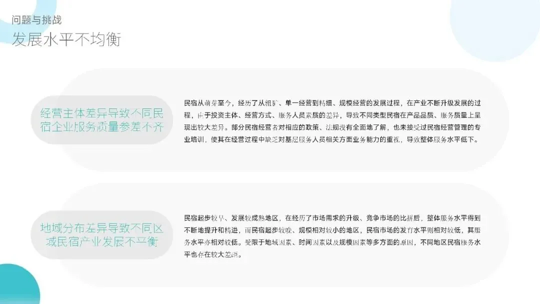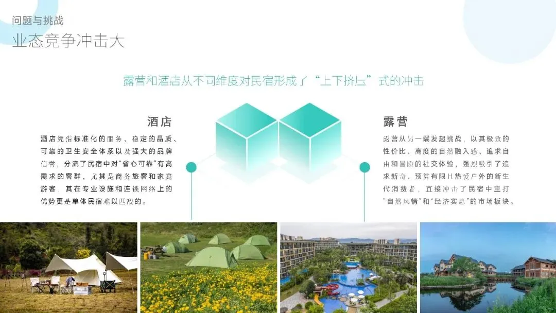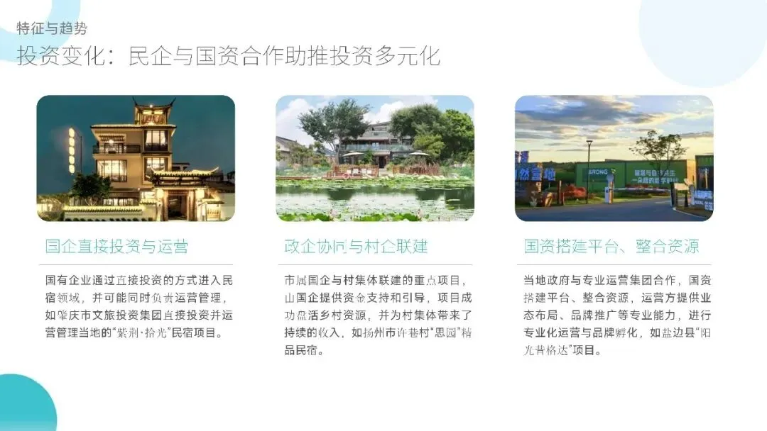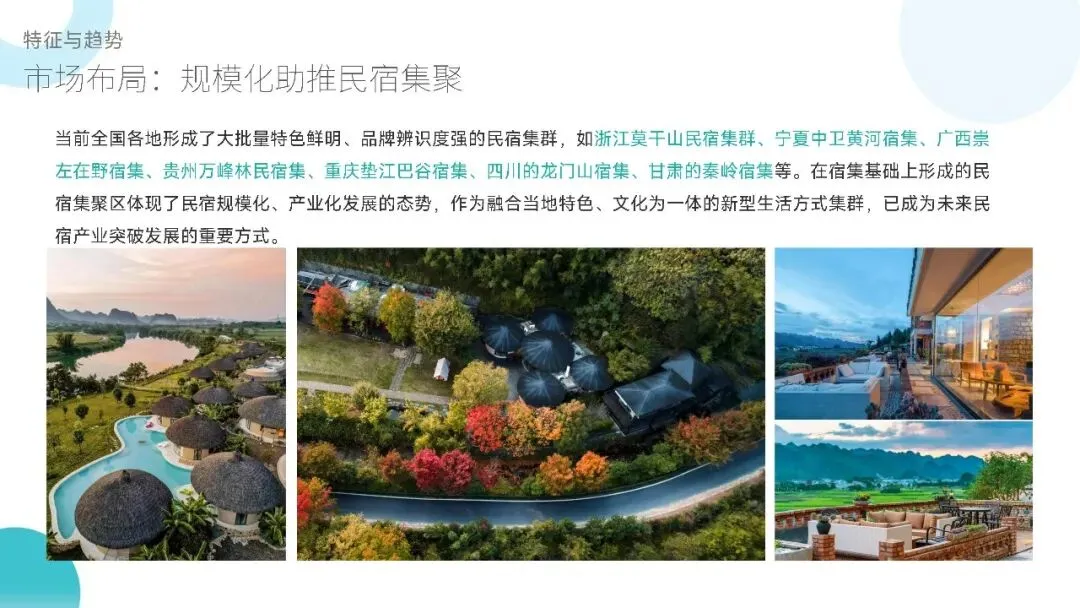 民宿的市场布局也在发生深刻变化,下沉市场成为行业增量蓝海,2024 年民宿预订量整体增幅超三成,二三线城市的预订增速显著高于一线城市,小城游、奔县游的兴起让民宿产业不断向低线城市渗透,2024 年热门小城的民宿预订量同比增长 2 倍。规模化发展也推动了民宿集聚效应的形成,全国各地涌现出一批特色鲜明的民宿集群,成为民宿产业产业化发展的重要体现。