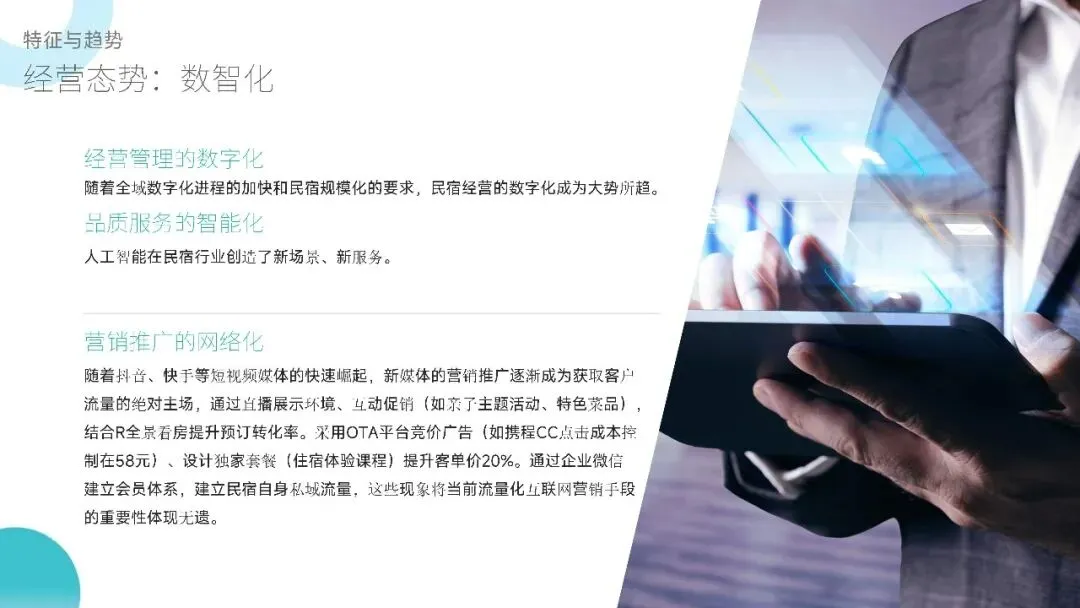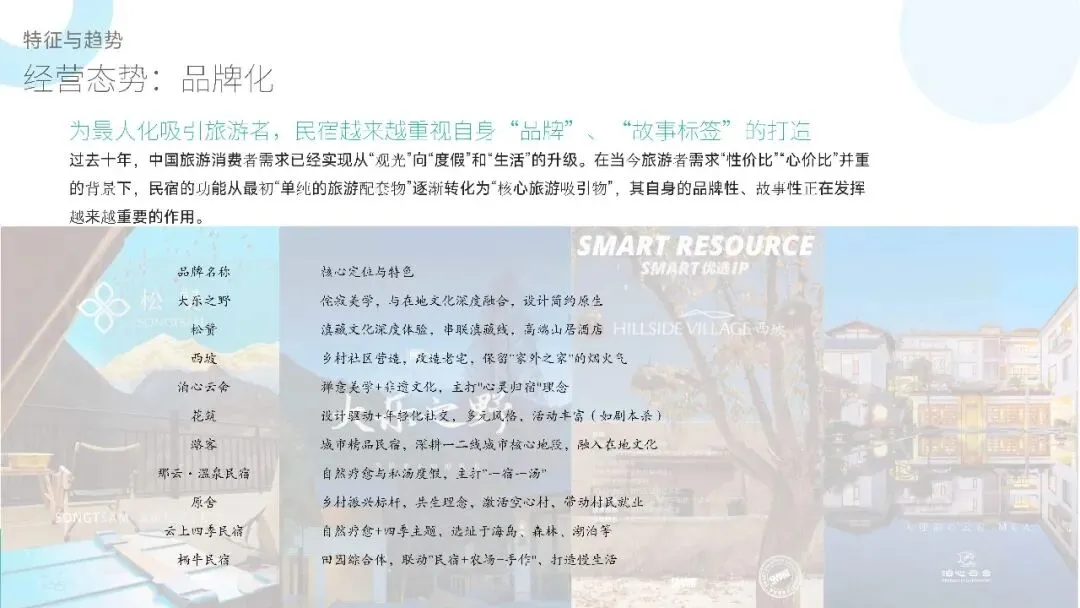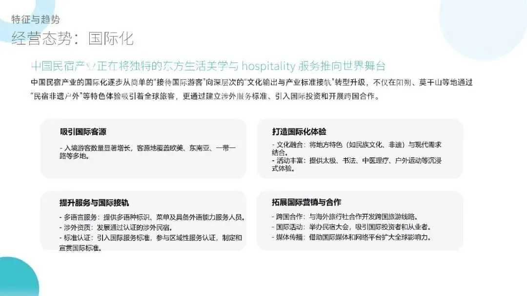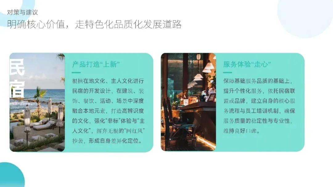 数智化与品牌化成为民宿经营的核心驱动力,经营管理的数字化、品质服务的智能化、营销推广的网络化成为行业趋势,民宿也不再只是旅游配套设施,而是逐渐成为核心旅游吸引物,越来越多的民宿开始打造自身的品牌特色和故事标签,以满足游客对性价比和心价比的双重需求。中国民宿产业的国际化步伐也在加快,从单纯接待国际游客向文化输出与产业标准接轨转型,东方生活美学正通过民宿这一载体走向世界舞台。