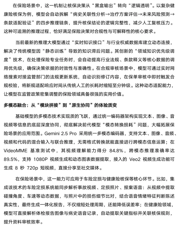 2. 多模态融合从“模块拼接”到“原生协同”,Gemini 2.5 Pro等支持文本、图像、音视频混合输入推理,大幅拓展车险定损、健康险核保等场景应用;