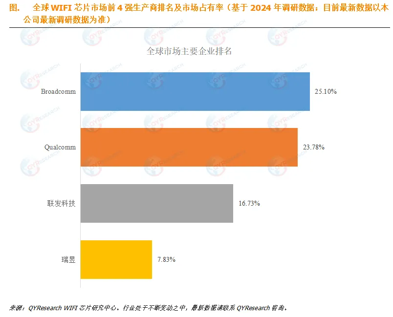 2024年全球Wi-Fi芯片市场,排名前四位的博通、高通、联发科、瑞昱,其销售收入市场份额分别为25.10%、23.78%、16.73%及7.83%,合计市场份额达73.45,行业集中度显著。