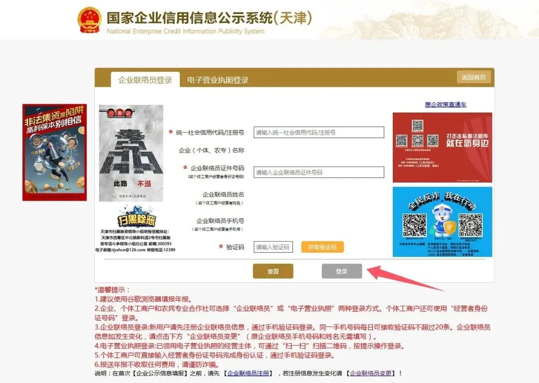 根据页面提示,输入相关信息,然后输入手机验证码,点击登录进入系统。