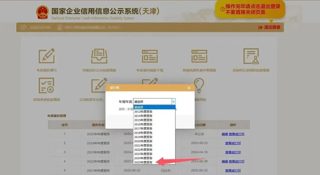 点击年度报告填写后,页面会显示年报年度选择弹窗,选择相应的报告年度,点击确定进入下一步。