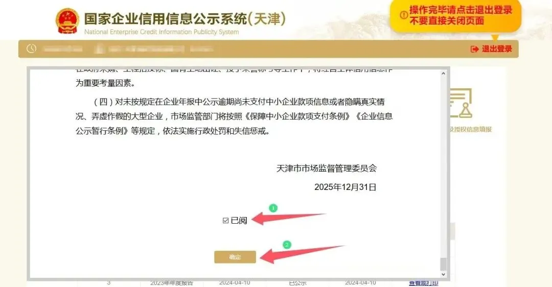 选择报告年度后,页面会依次显示填报须知、2025年度经营主体报送公示年报重点提示、经营主体年度报告填报公示信用承诺书等提示,用户需要仔细阅读,勾选已阅,点击确定后进入年报填写页面。