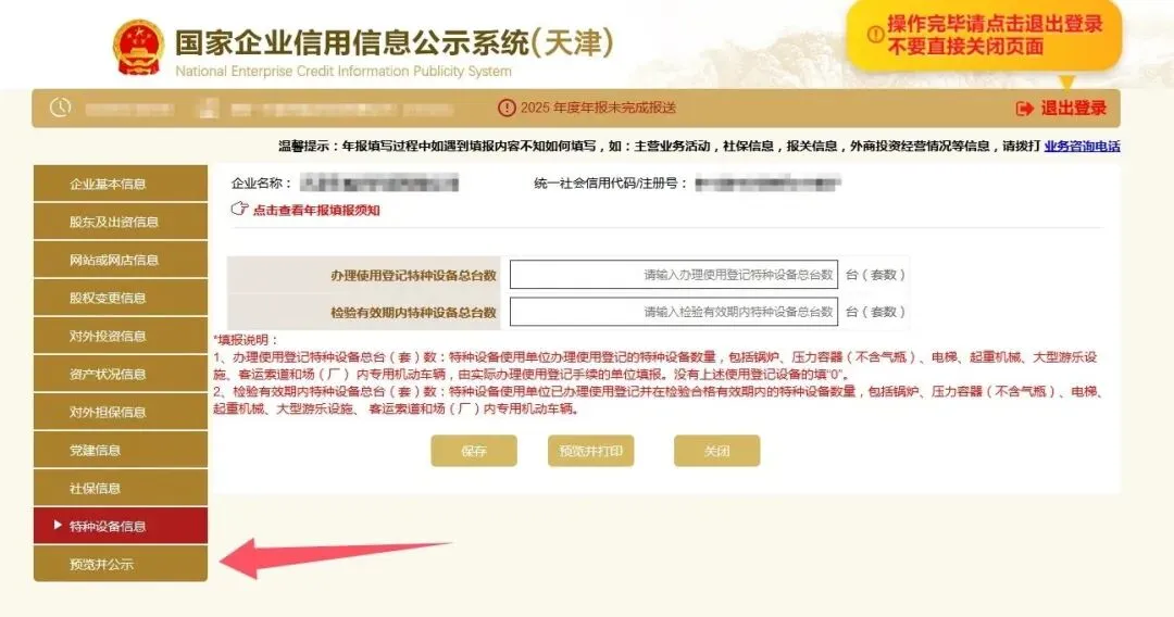 左侧黄色页签里的表格都是年报的内容,全部填写保存之后,点击预览公示按钮进入年报预览页面。