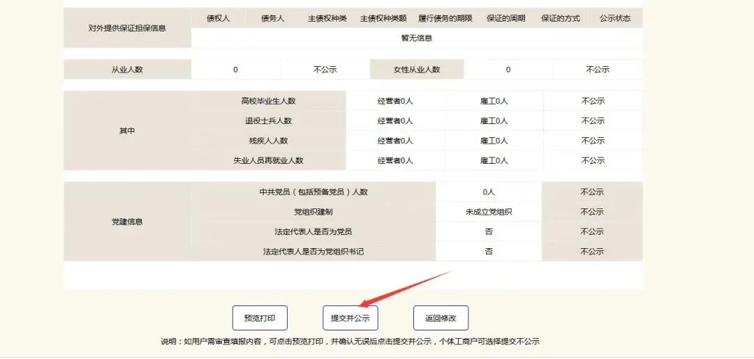 在预览页面,可以查看年报全部填写的内容,企业可以再检查一遍,年报检查后没有问题,点击预览页面下方的提交并公示按钮提交年报。