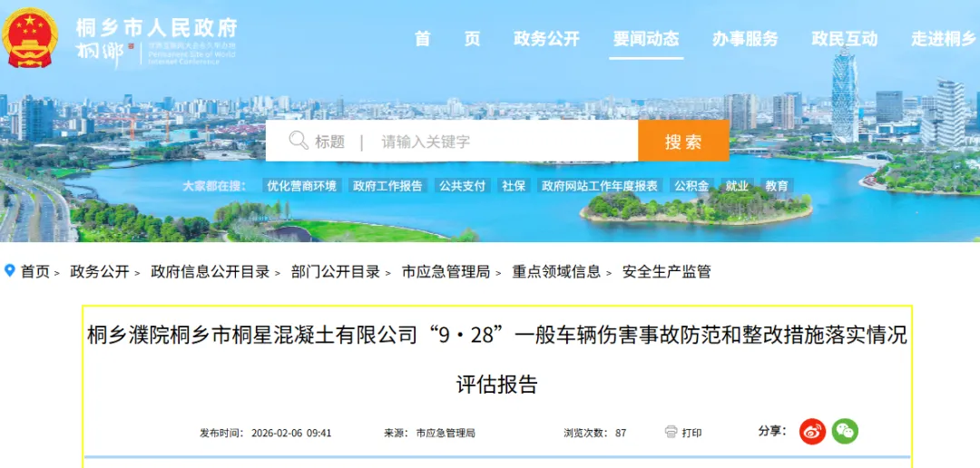 近日,桐乡市安全生产委员会办公室发布桐乡濮院桐乡市桐星混凝土有限公司“9·28”一般车辆伤害事故防范和整改措施落实情况评估报告。桐乡市安委办组织成立由市应急管理局、市纪委监委、市公安局、总工会、市交通运输局等相关部门人员组成的事故检查评估组,于2026年1月23日对桐乡市桐星混凝土有限公司“9·28”一般车辆伤害事故防范和整改措施落实情况开展评估,评估情况通报如下:
