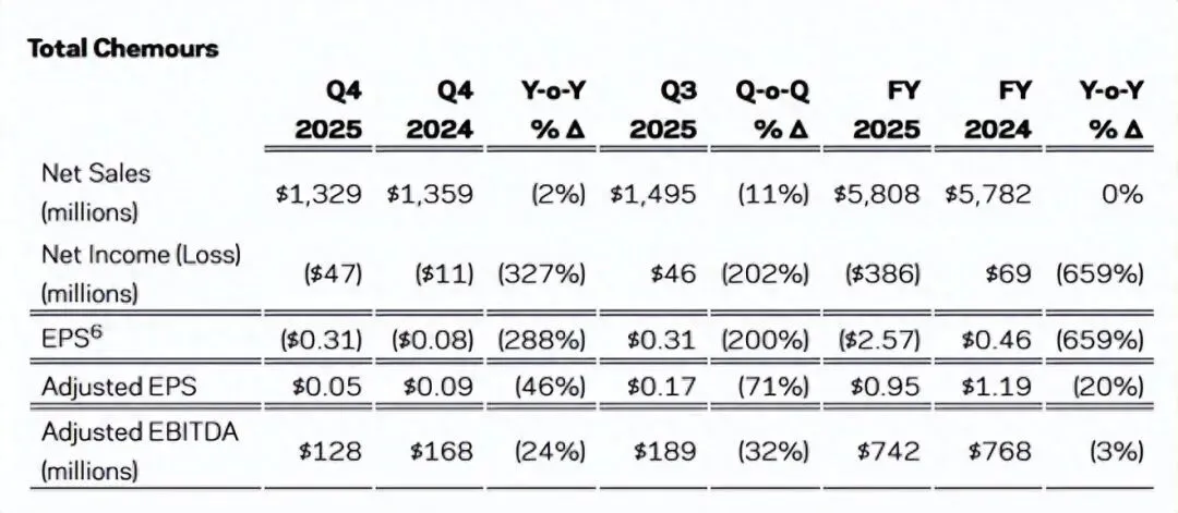 近日,全球钛白粉巨头科慕(Chemours)发布了2025年第四季度及全年财务业绩。数据显示,公司全年实现净销售额58.08亿美元,与2024年基本持平。然而,归母净利润出现3.86亿美元亏损,同比大幅下滑659%。亏损的主要原因是公司计提了超过3亿美元,用于与PFAS相关的诉讼和解及环境治理支出。剔除这些特殊项目后,调整后的息税折旧摊销前利润(EBITDA)为7.42亿美元,同比微降3%,但在行业整体下行的背景下,仍显示出较强的经营韧性。