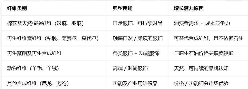 再生 PET(rPET)、再生尼龙预计将在运动装、快时尚、户外功能服饰中替代原生聚酯。紧身裤、外套、雨衣等功能性服装可大量使用再生纤维,且不牺牲产品性能。注重可持续发展的品牌或将加快这一替代进程。运动装与快时尚领域需求尤为旺盛,尤其是主打环保材料的品牌。