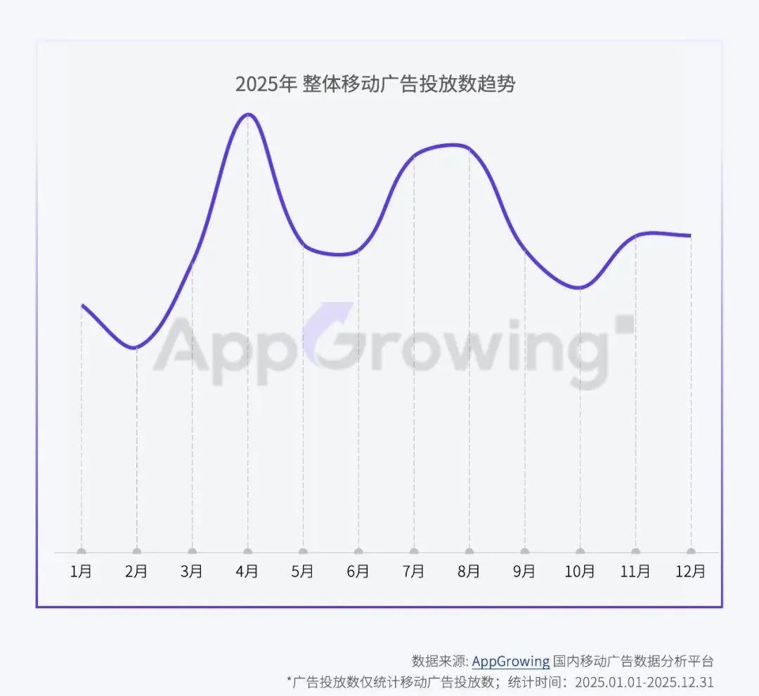 2025年,AppGrowing 累计监测到全网在投广告近14亿,整体广告投放数为2024年(7亿+)的近2倍。整理回顾2025年全网投放数据,可以得出以下结论:
