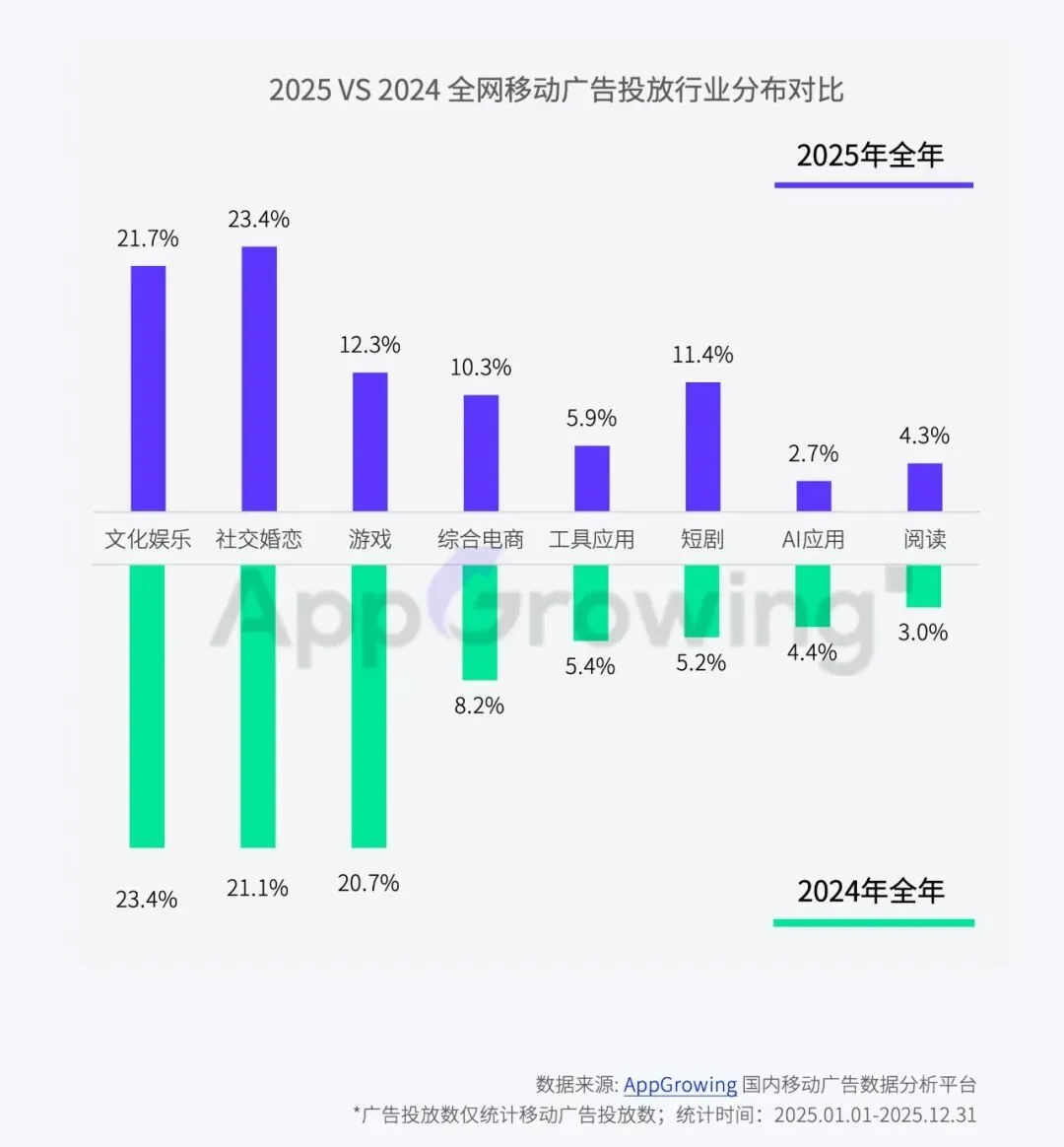 从大盘来看,2025 年全网移动广告投放呈现显著结构性升级。社交婚恋、短剧投放占比持续提升,文娱、游戏、综合电商投放占比有所回落,折射在流量成本高企下,行业已从粗放式投放转向精准化、场景化布局,更注重转化效率与赛道增量价值。