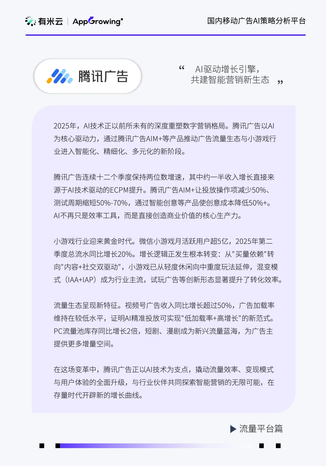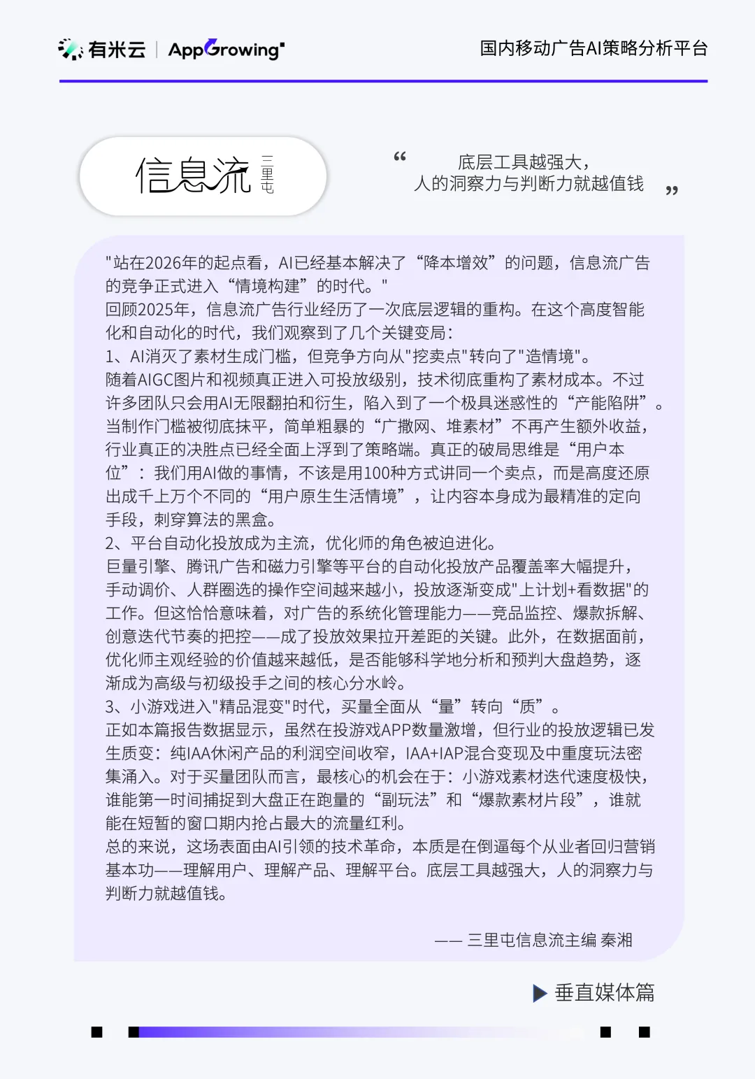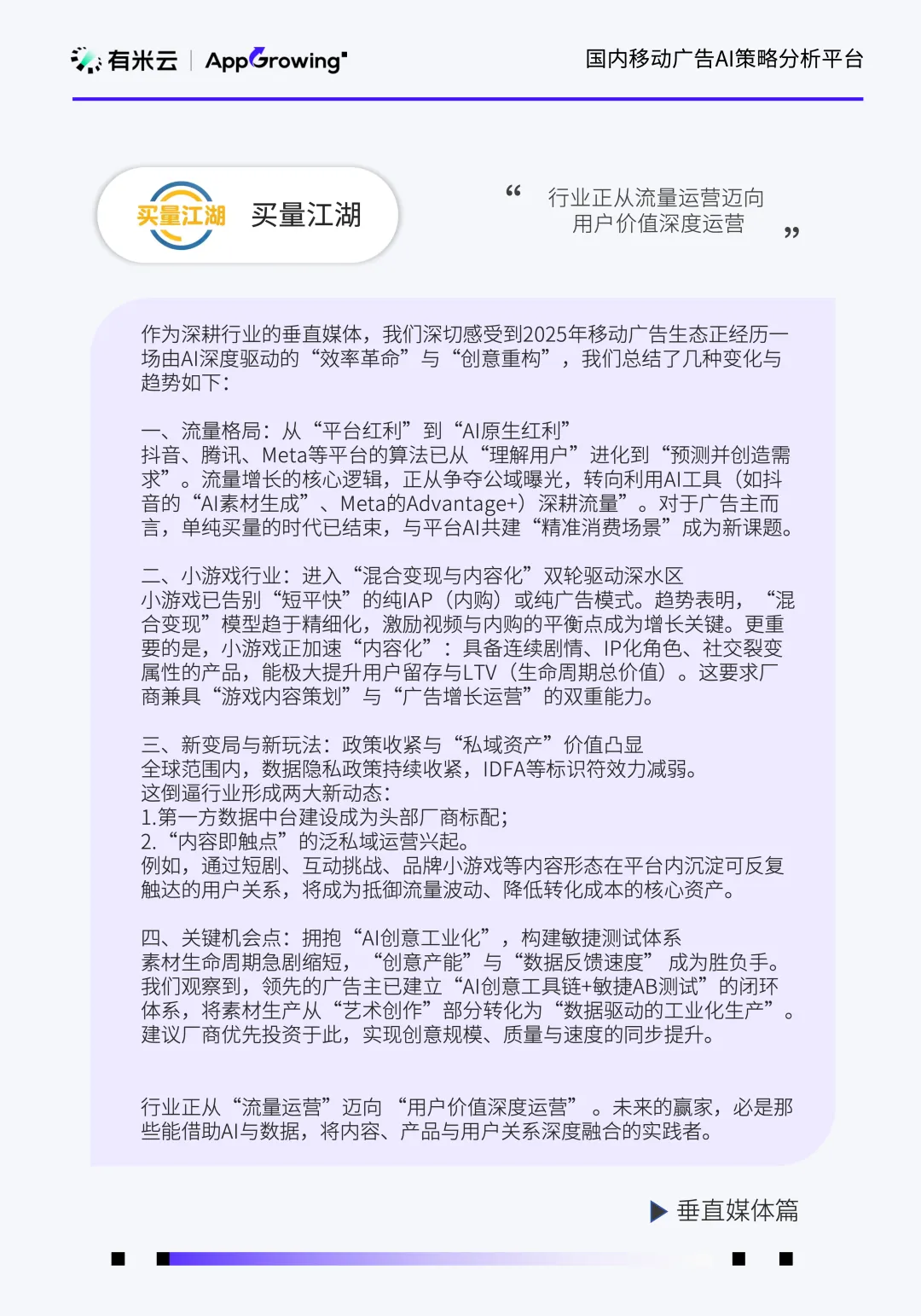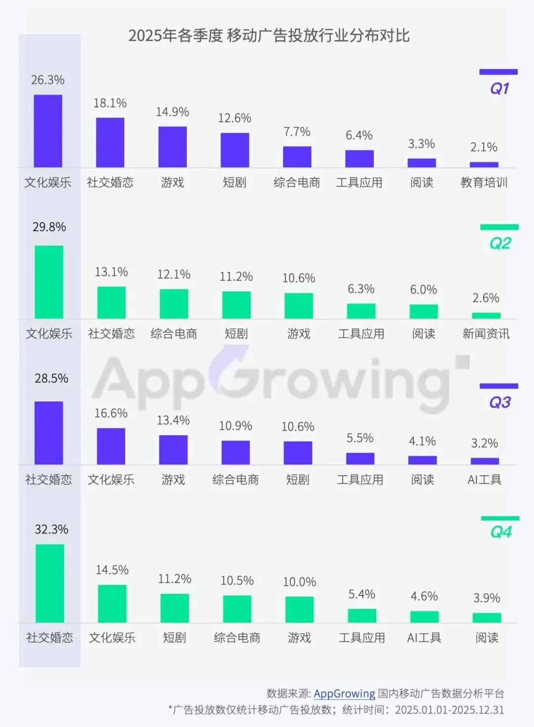 行业投放策略随消费节点、内容生态与技术落地动态调整。Q1 聚焦文娱内容营销,Q2 受电商大促驱动,综合电商投放占比提升;Q3 起社交婚恋成为核心赛道,短剧、AI 工具等新兴赛道占比持续攀升。
