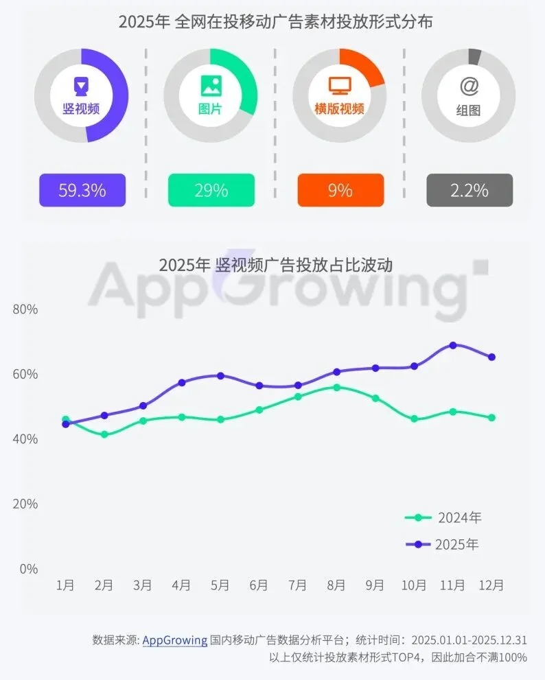广告投放形式依旧以视频形式为主,但是环比2024年,竖视频广告素材数占比下降明显,图片素材占比则提升至35.8%。