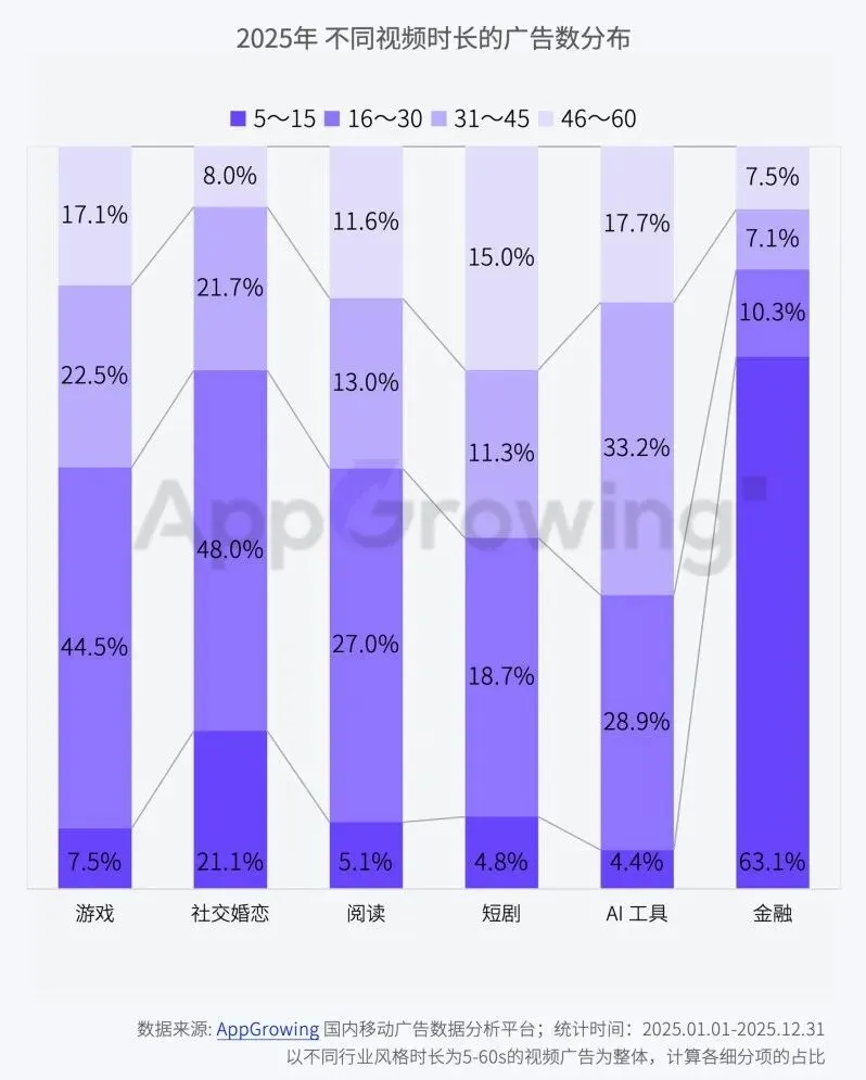 各行业视频素材时长呈现明显分化:金融主打短时效素材,金融 5-15 秒占比超 6 成,追求快速触达;游戏、社交婚恋则侧重 16-45 秒中长素材,侧重内容叙事;阅读、短剧依赖 46 秒以上长时素材,适配内容沉浸传播。